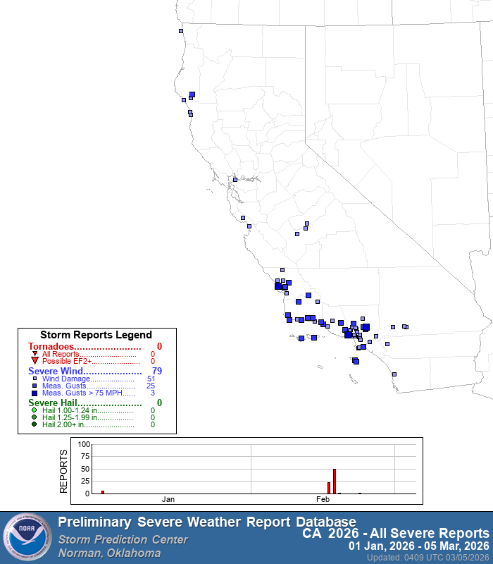 Note the wind damage reports in California: