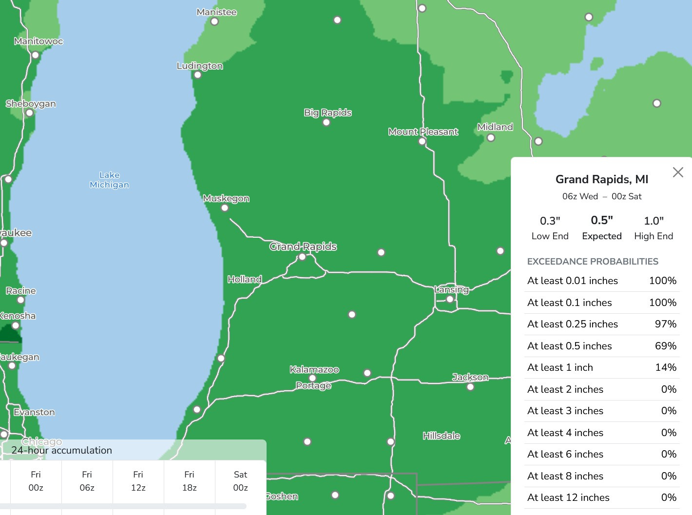 Over the next 3 days, we should get around 1/2” of rain. This model is forecast 1/2” for Grand Rapids…high end an inch. This will slow the fall of area rivers, but not cause any significant bump in levels. The Grand River at Comstock Park is in moderate flood, about 3.3 feet above flood stage.