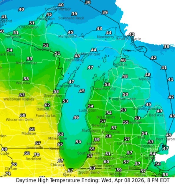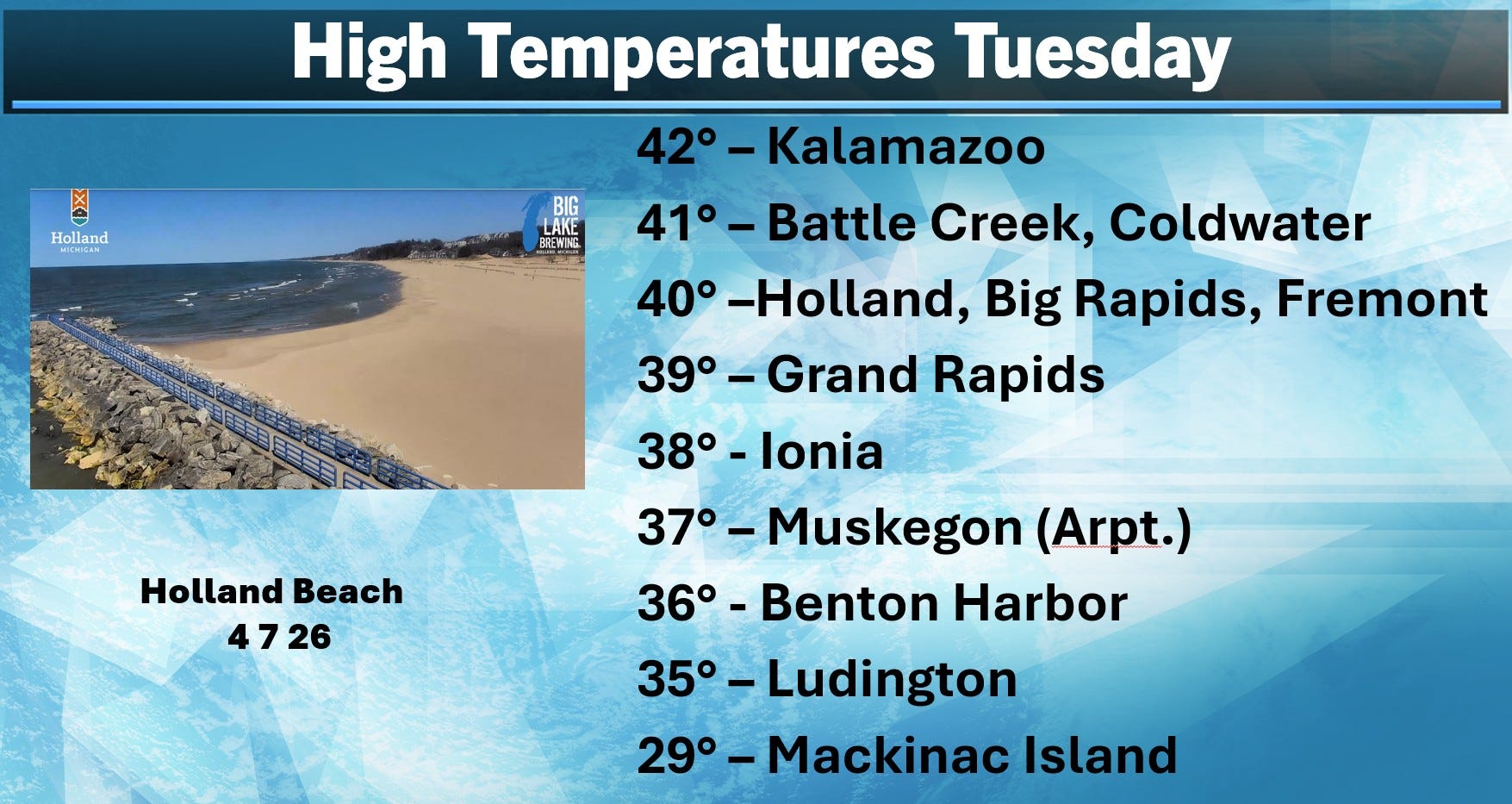 First a look at high temperatures from Tuesday. With an average high of 54, these temperatures were 10-20 degrees cooler than average. That was despite full sunshine and a relatively light wind. Early Tuesday morning, the temperature dipped to 20 in Grand Rapids. It was colder in the U.P. and northern Lower Michigan where there was snow on the ground. Raco crashed to -5 Tue. AM. Other low temperatures: Houghton +1, Marquette and Pickford 2, S. Ste. Marie 5, Pellston 8 and Mackinac Island 10.