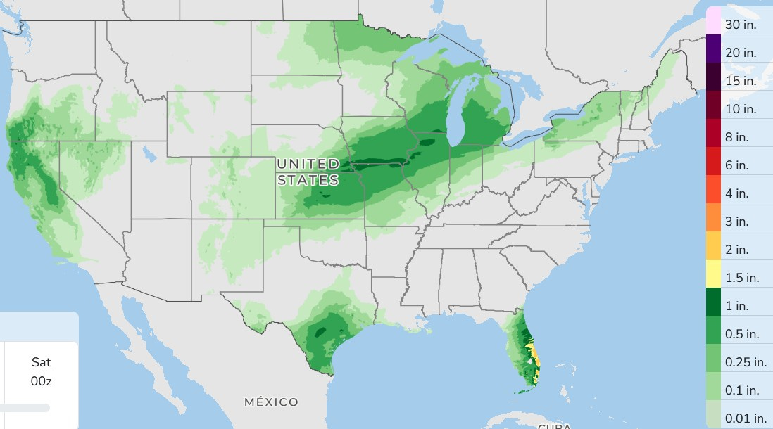 Here’s rainfall for the next 3 days combined. It rains in places that don’t usually get a lot of rain at this time of year…central California, south Texas and the Florida Peninsula. The storm system that will pull the warmer air back up into Michigan will leave a swath of rain from Kansas to Michigan. While thunder isn’t out of the question, most of this will be showers/rain and severe weather is not expected.