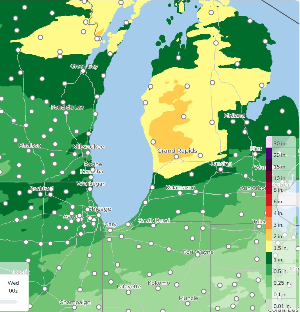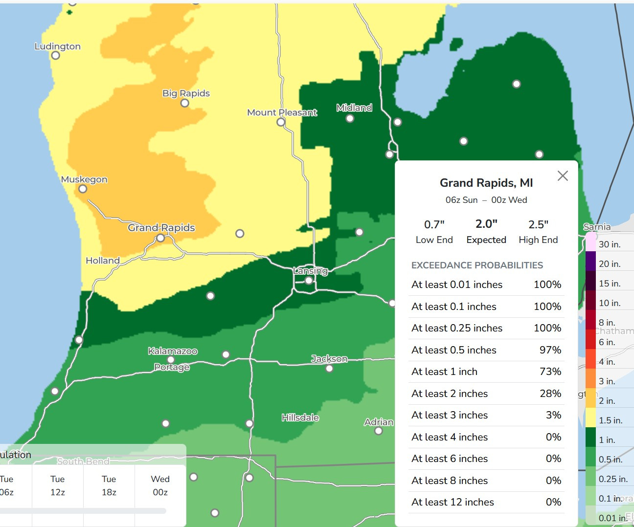 Here’s a close-up map of expected rainfall from Sunday - Tuesday. Grand Rapids gets around 2”. The +2” area extends to the north toward Cadillac. The Grand River begins down near Hillsdale and rainfall totals won’t be quite as high there. However, if this map verifies, this means significant rain on the Muskegon, White, Pentwater, Pere Marquette and Manistee Rivers.
