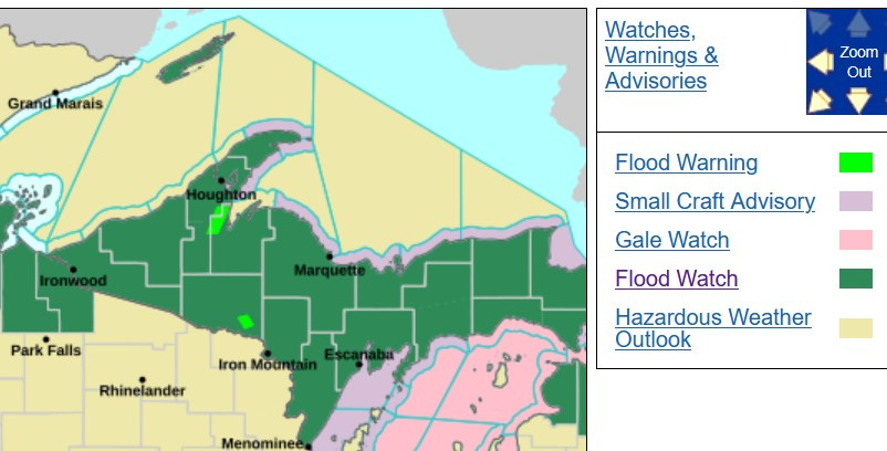 A Flood Watch has been posted for all of Upper Michigan and 3 counties in northern Lower Michigan where there is still snow on the ground (Emmet, Cheboygan and Presque Isle). A combination of snow melting and moderate to heavy rain could cause flooding this week in the U.P.