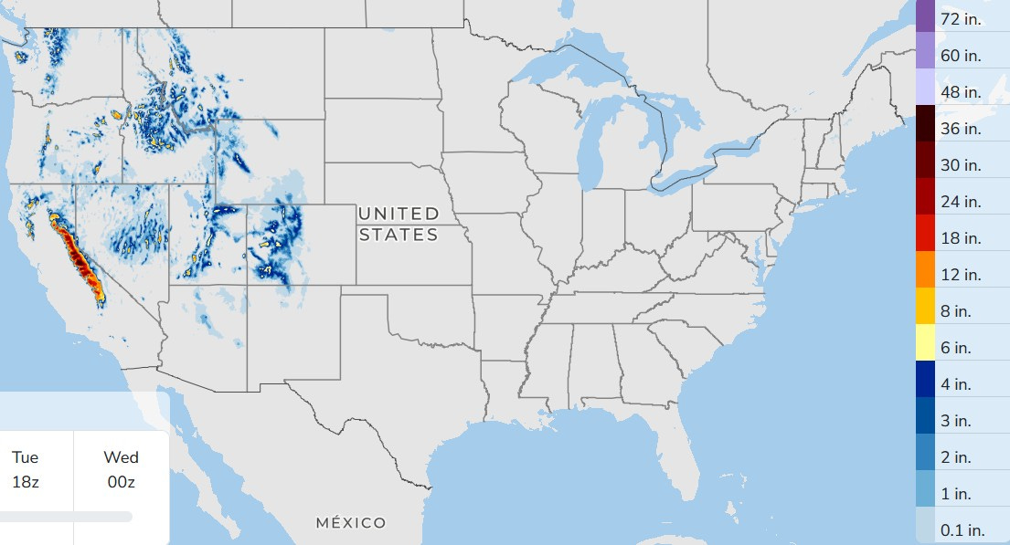 Here’s the 66 Hour snowfall forecast. Note there is none forecast east of the Rockies - too warm for snow. The snow in the higher elevations out West is welcome as they are below average for snowfall this winter. The Sierra Nevada mountains of California should see heavy snowfall totals this week, measured in feet, not inches.