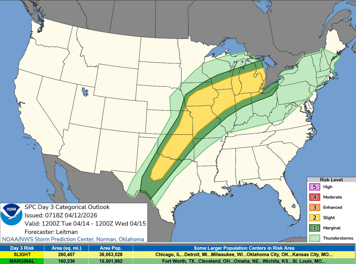 This is the Severe Weather Outlook Map for Tuesday/Tuesday night. This looks like our best chance of a strong to severe storm. The yellow area is a Slight Risk (level 2) and that runs from Texas to Ontario. SPC says: “…surface boundary should support isolated to scattered storm development by late afternoon/evening. Supercell wind profiles are evident in forecast soundings, suggesting an all-hazards risk. Given uncertainty related to potential airmass contamination from early day convection and cloud cover, and potential capping concerns, will maintain Slight risk (level 2 of 5). However, a rather volatile thermodynamic and kinematic environment will exist across portions of the region, and higher probabilities may be needed in subsequent outlooks depending on forecast trends and mesoscale details.”