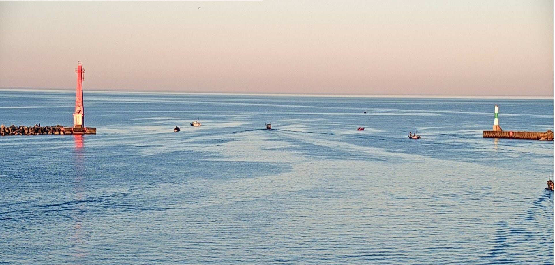 We had a light offshore wind Saturday, so Lake Michigan was pretty calm. This pic. shows the Muskegon Channel in the early morning. I count 7 boats in the water in this pic. from the Muskegon Glerl camera. I would assume they were fishing boats.