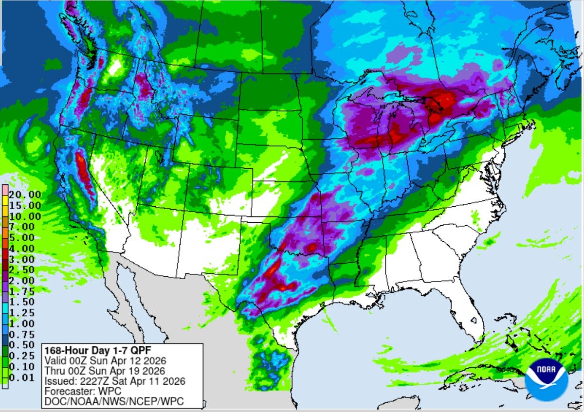 This is the 7-day combined rainfall total forecast from the Weather Prediction Center. Some of the heaviest rain in the U.S. will fall in West Michigan this week. A front will move back and forth, bringing successive rounds of rain and storms from Texas to the Great Lakes.