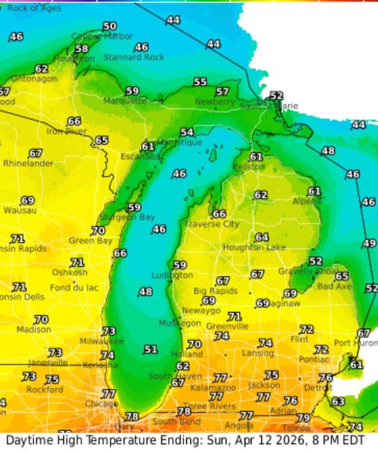 Here’s forecast high temperatures for this Sunday in Michigan. It’ll reach the upper 70s south of I-94, low to mid 70s up to Grand Rapids, 60s north of Kent County where there will be more clouds and showers. The warm air surges north and readings should reach the 50s even up at S. Ste. Marie and Munising.