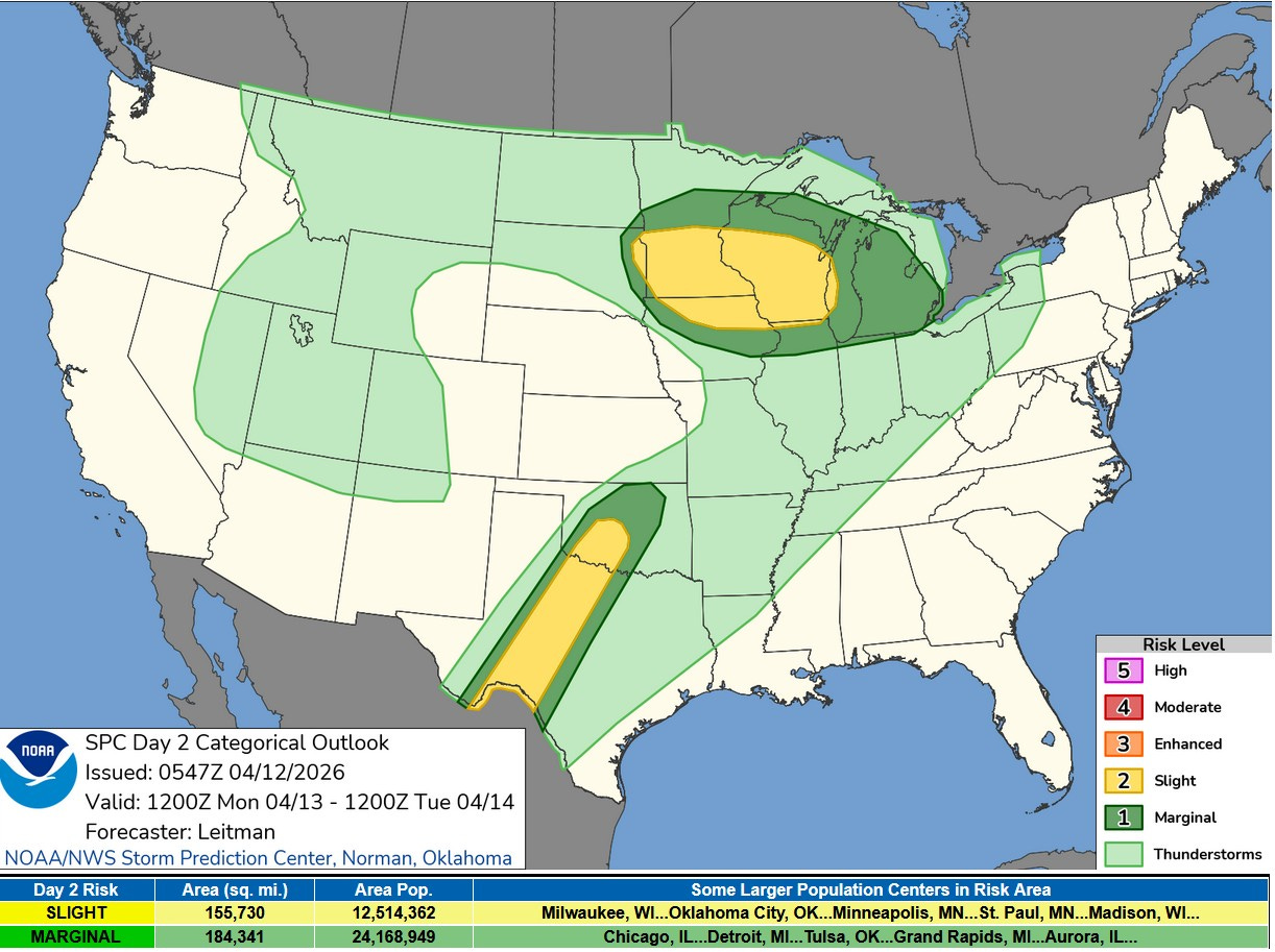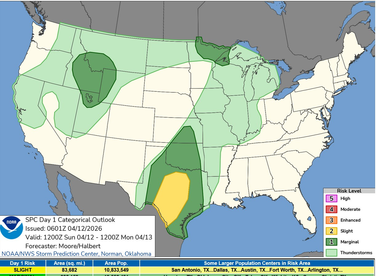 Here’s the Severe Weather Outlook map for this Sunday PM. Michigan is in the light green “General” Thunderstorm Outlook Area. So, while we might get a thunderstorm, it’s unlikely to be severe. There is a Slight Risk (level 2) in Texas and Marginal (level 1) outlooks in the Rockies and across parts of northwest Wisconsin and northern Minnesota.
