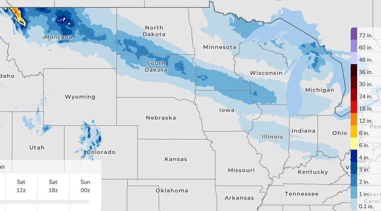 That system will likely bring us some snow…nothing major, probably an inch or two. However that could bring a period of slippery roads. The map above is the 66-Hour Snowfall map. You can see the band of snow from Montana to SW Michigan. This map only goes out 66 hours, so it doesn’t include the snow for Saturday night.