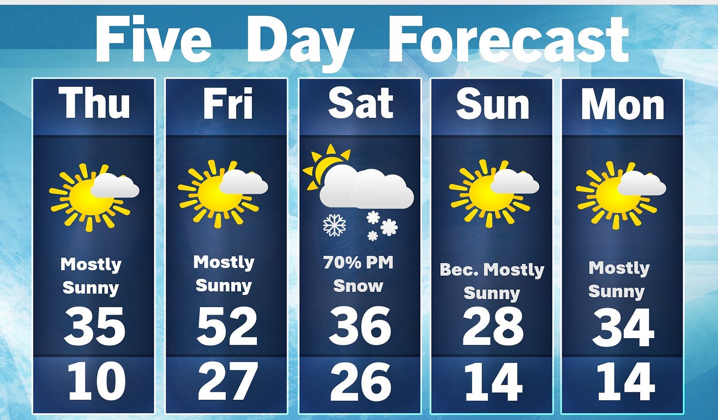 Today should be a nice day…mostly sunny and a touch above freezing this PM. The snow that’s in the sun will melt and it will feel a bit warmer than the temperature indicates because of the sun and a wind of only 10 mph this afternoon.