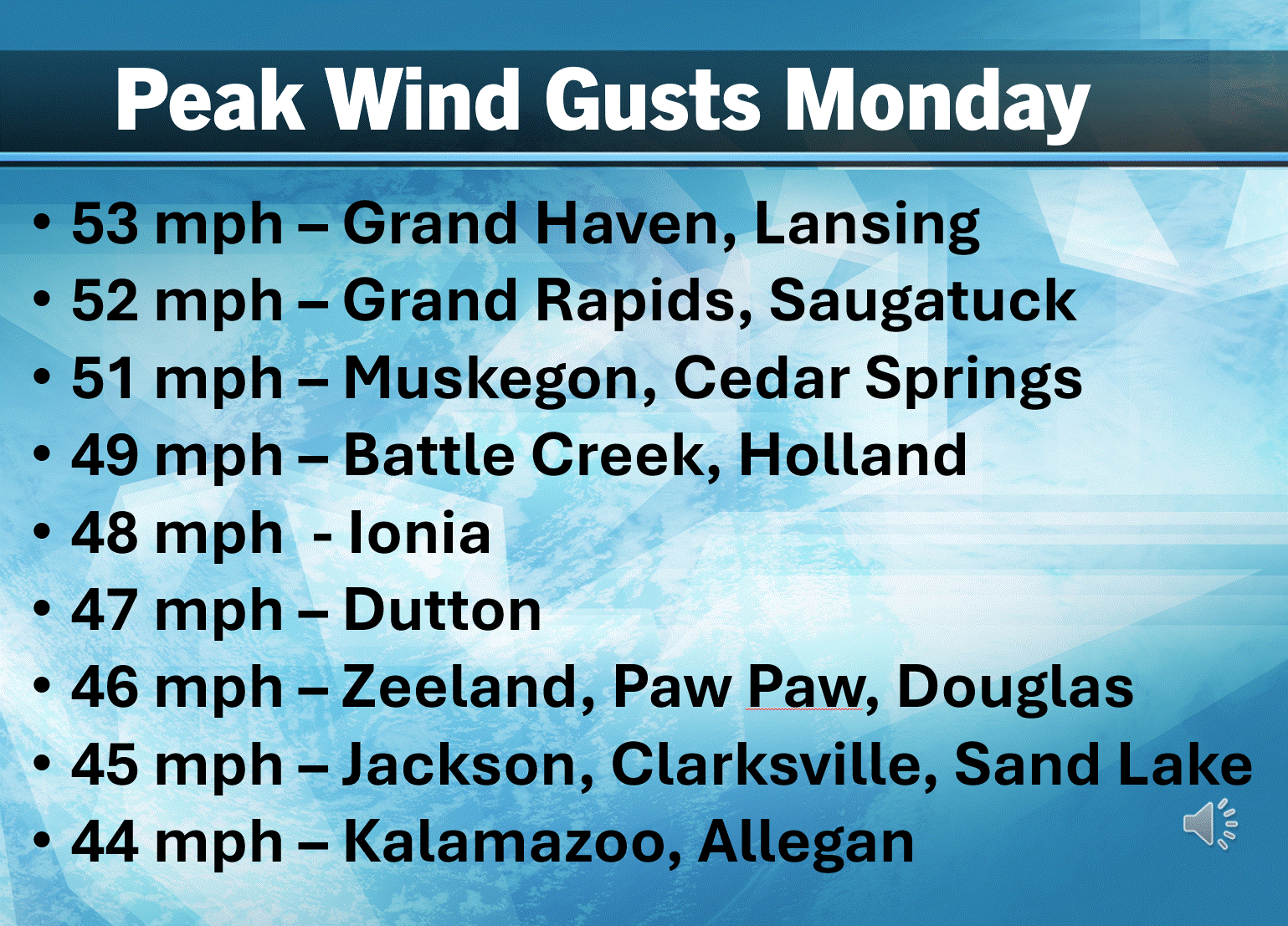 Peak wind gusts in West Michigan were generally between 40-53 mph. Despite the fact that our snow cover was rather hard, there still was some significant blowing and drifting snow.