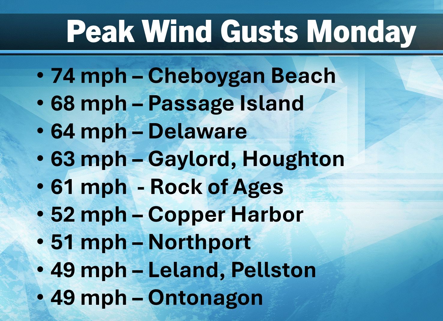 Here’s some peak wind gusts from northern Lower and Upper Michigan. Leading the list was a 74 mph gust on the beach near Cheboygan. That’s hurricane force. Passage Island had the highest gust in the U.P. at 68 mph.