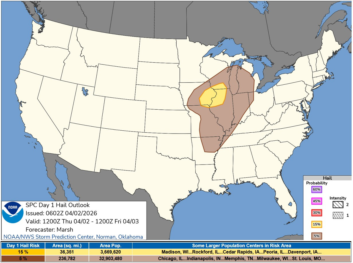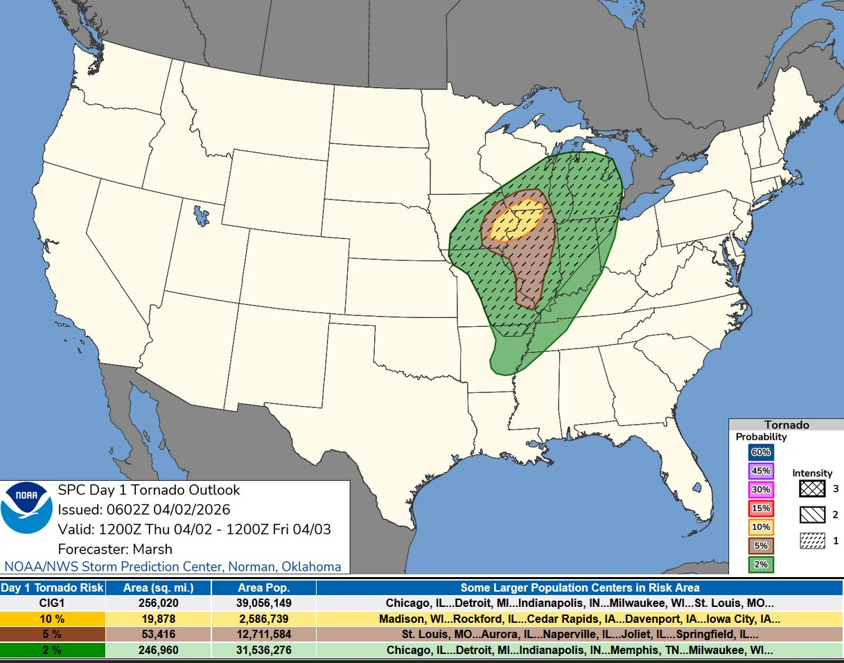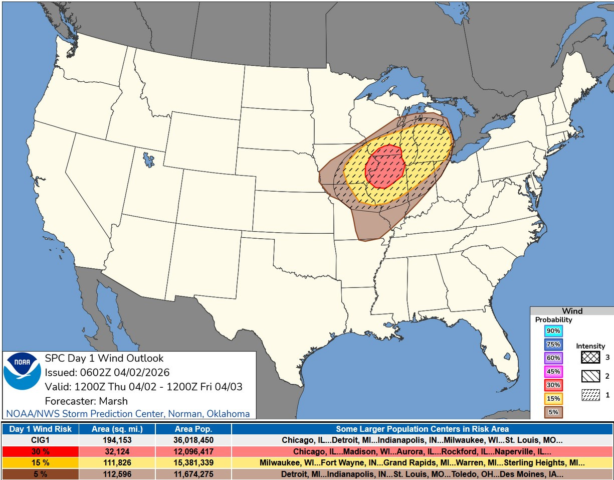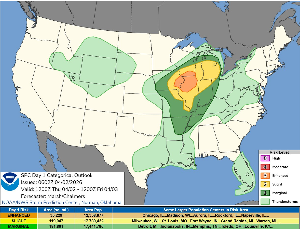 That’s a level 3 Enhanced Outlook in the orange color for E. Iowa, N Illinois and S. Wisconsin and a level 2 risk over much of S. Lower Michigan. SPC says: “Severe thunderstorms capable of producing a few tornadoes appear probable across parts of eastern Iowa, northern Illinois, and southern Wisconsin this afternoon. Additionally, damaging thunderstorm winds will be possible from eastern Iowa northeast into Michigan.”