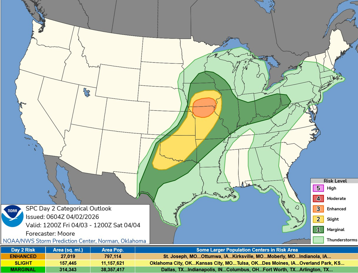 This is the Severe Weather Outlook Map from SPC for Friday/Friday night. The chance of severe weather shifts a little to the west, with an Enhanced Outlook for S. Iowa and N. Missouri and a level 2 Slight Risk from Central Iowa to N. Texas. The light green over Michigan is a risk of an isolated general (not severe) thunderstorm. I think most of Friday will be dry.