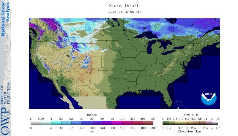 Here’s snow cover as of Monday 4/27 for the contiguous U.S. and southern Canada. A total of 9.2% of the contiguous U.S. has a snow cover. That’s almost all in the higher elevations of the western U.S. Snowfall this winter was below average over much of the West, especially in Colorado. Winter Park has had 197” of snow this winter, compared to an average of 345”, so that’s just 57% of of average. Breckenridge Ski Area had 155” of snow this winter, compared to an average of 355”. That was just 43% of average.
